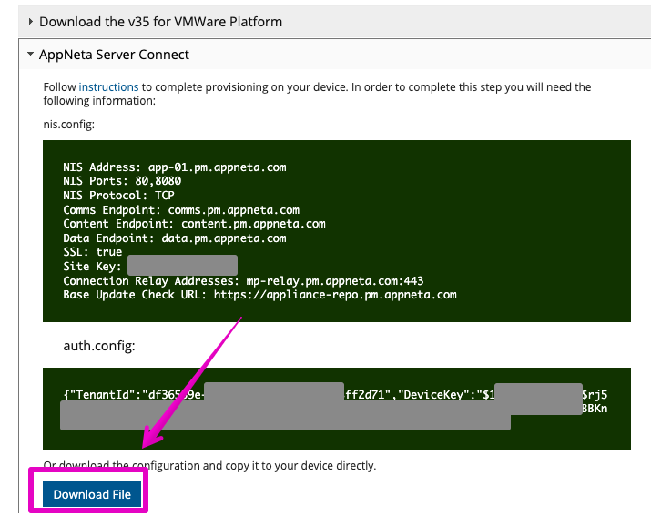 4. You should then see the AppNeta NIS.config and Auth.config details for your organization: