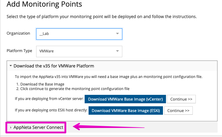 Look for the second section 'AppNeta Server Connect' and expand this. For Hardware appliances, you'll need to paste the MAC address from Eth0 and click continue. For virtual appliances, this step is not required.