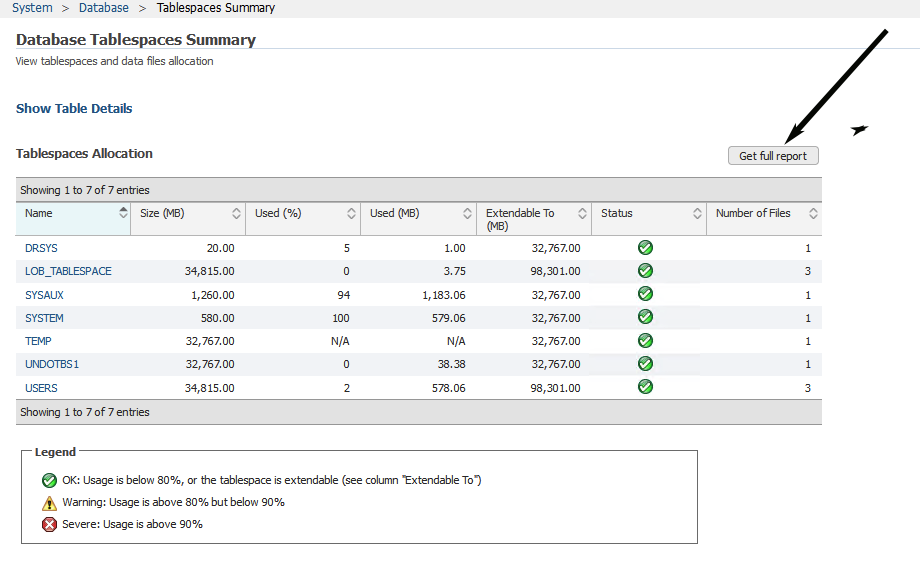 When selecting the Get Full Report in System>Database>Tablespace Summary. The report will not generate.