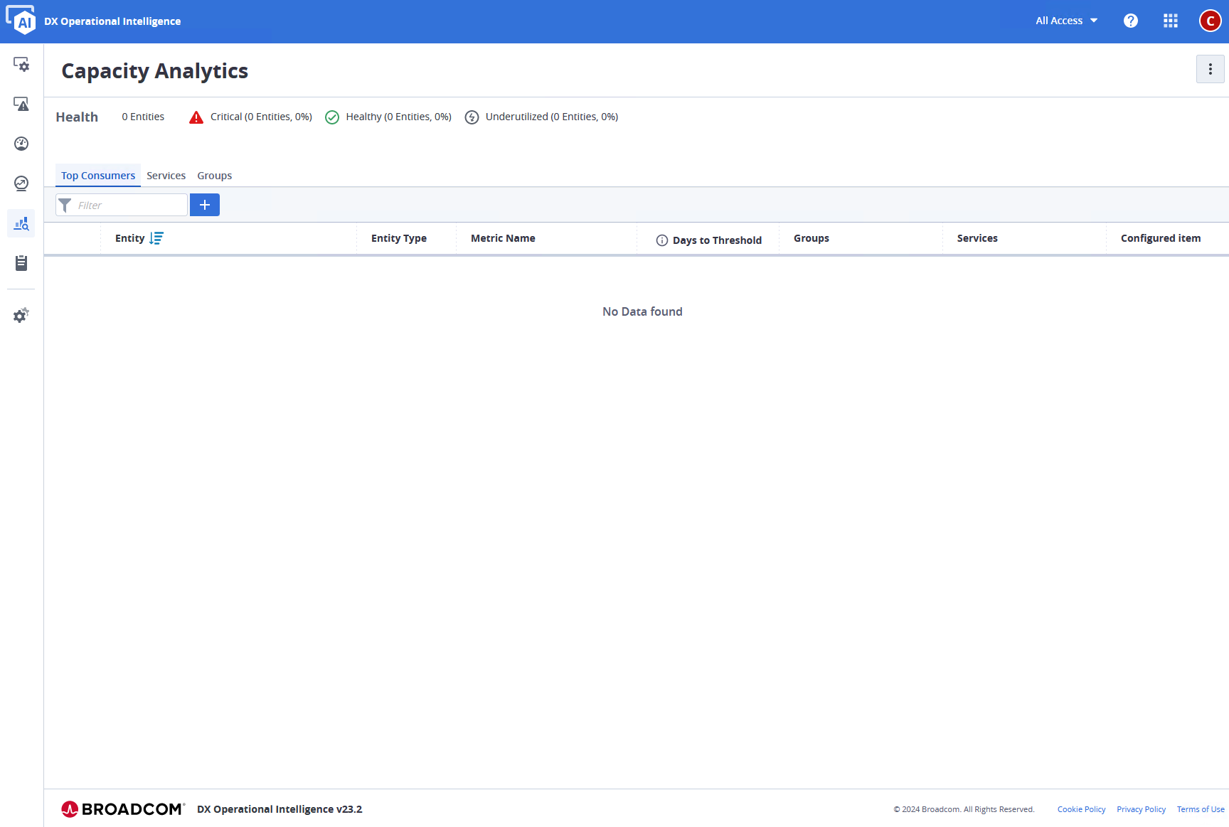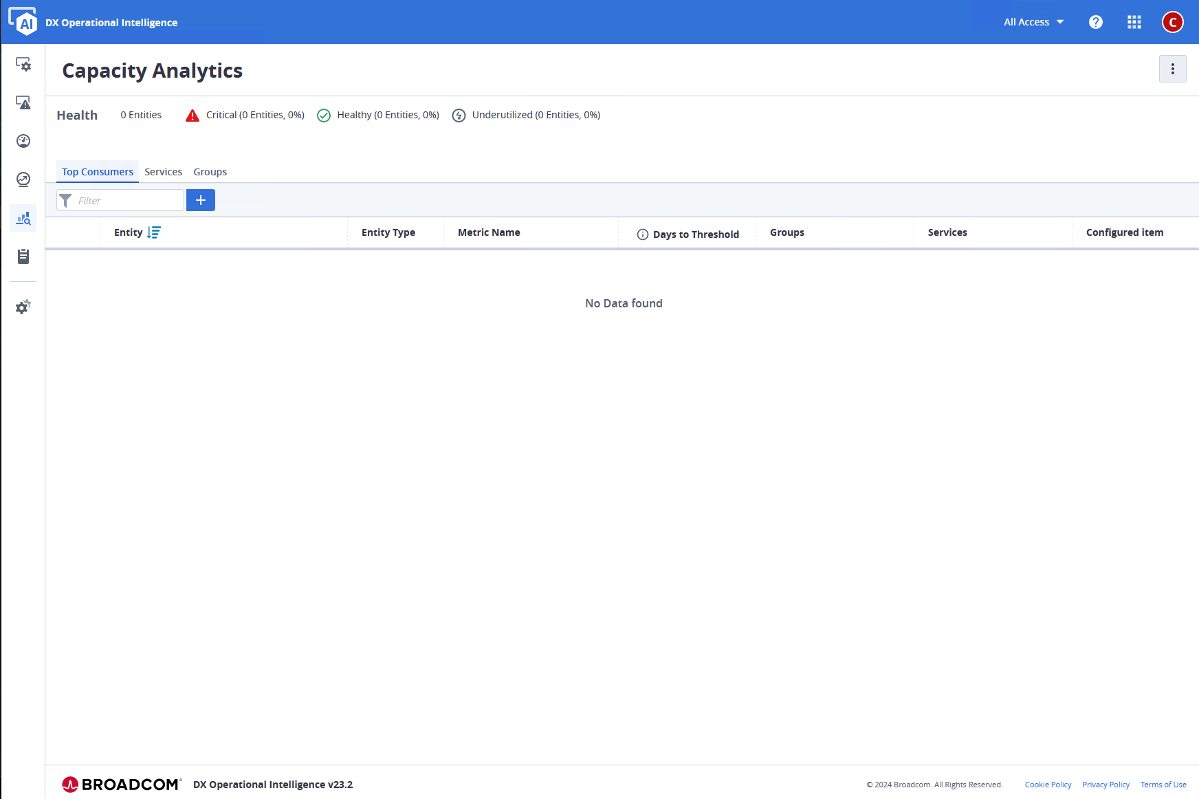 Any other action regarding adding more entities to the DX OI view must be discussed with the Broadcom Support/Development team to avoid any performance impact If changes by themselves.