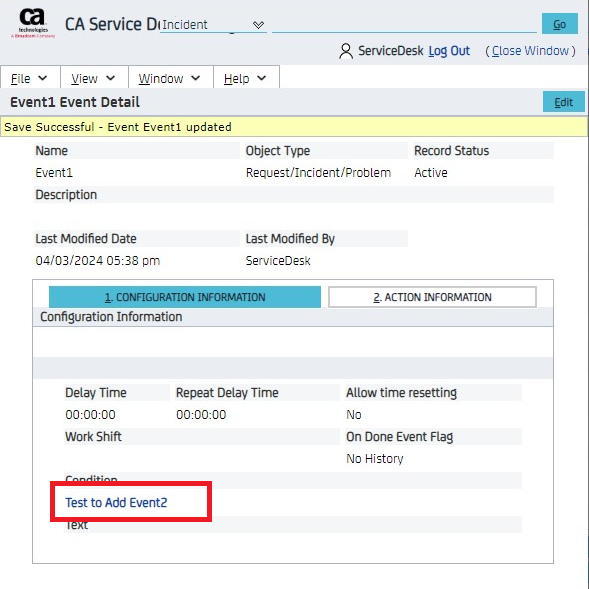 Event1 would be defined to test if Event2 is appropriate. Event1 will fire immediately on attachment to the ticket via the Update Status activity notification to test based on a custom Site Defined Condition called "Test To Add Event2".