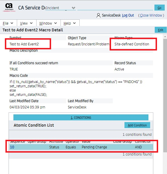 The site defined condition would check if the conditions are right to add Event2. This one is a simple test of the ticket status for one of the Pending statuses and is listed below as a basic example of the condition design. Additional conditions may also be included based on needs.
