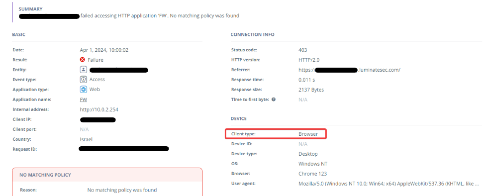 The ZTNA logs fo the user requests confirm that no matching policy was found as shown below: