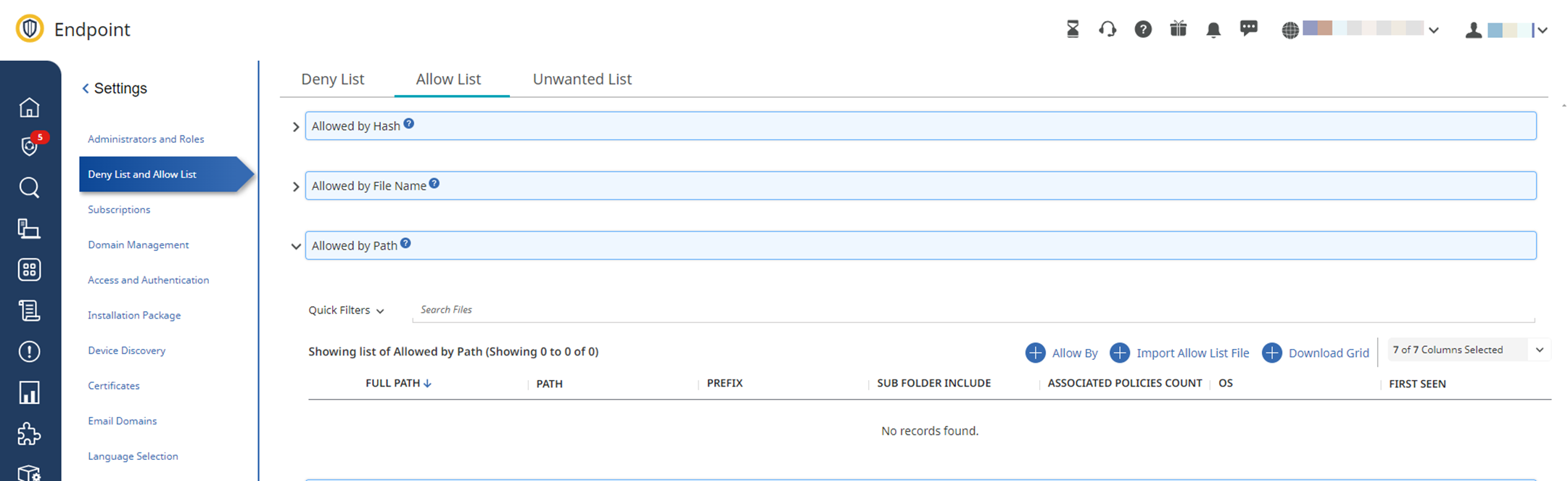 When viewing the central list of all the artifacts (file hash, URLs, Domains, and certificates) that are included in Deny List and Allow List policies, the Allow List - Allowed by Path shows No Records Found
