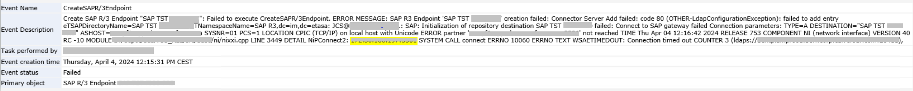 Create SAP R/3 Endpoint "SAP TEST XXX XXX": Failed to execute CreateSAPR/3Endpoint. ERROR MESSAGE: SAP R3 Endpoint 'SAP TEST XXX XXX' creation failed: Connector Server Add failed: code 80 (OTHER-LdapConfigurationException): failed to add entry eTSAPDirectoryName=SAP TEST XXX XXX,eTNameSpaceName=SAP R3,dc=im,dc=etasa: JCS@ABCDEFGH001: SAP: Initialization of repository destination SAP TEST XXX XXX failed: Connect to SAP gateway failed Connection parameters: TYPE=A DESTINATION="SAP TEST XXX XXX" ASHOST=vmabcdefgh.domain.com SYSNR=01 PCS=1 LOCATION CPIC (TCP/IP) on local host with Unicode ERROR partner 'vmabcdefgh.domain.com:3301' not reached TIME Thu Apr 04 11:12:40 2024 RELEASE 753 COMPONENT NI (network interface) VERSION 40 RC -10 MODULE D:/xxx/xxx/xxx/xx/nixxi.cpp LINE 3449 DETAIL NiPConnect2: 1x.1x.1x.1x.:3301 SYSTEM CALL connect ERRNO 10060 ERRNO TEXT WSAETIMEDOUT: Connection timed out COUNTER (ldaps://ABCDEFGH001.domain.com:20411),