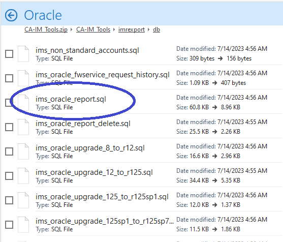 Once downloaded you can unzip the directories for any of the remote tools you need. The DB files and ims_oracle_report.sql is located in the CA-IM_Tools.zip \CA-IM_Tools\imexport\db.