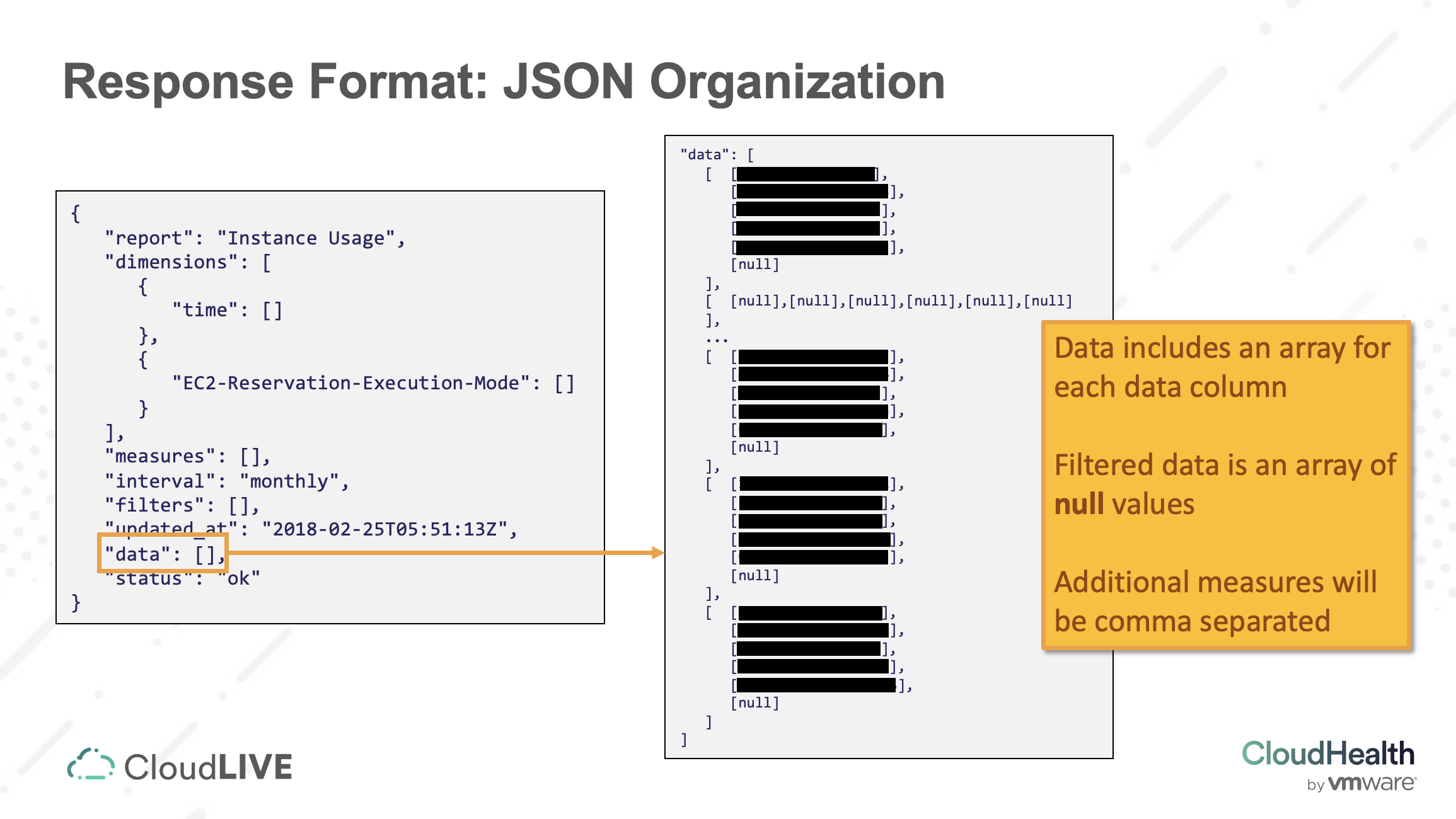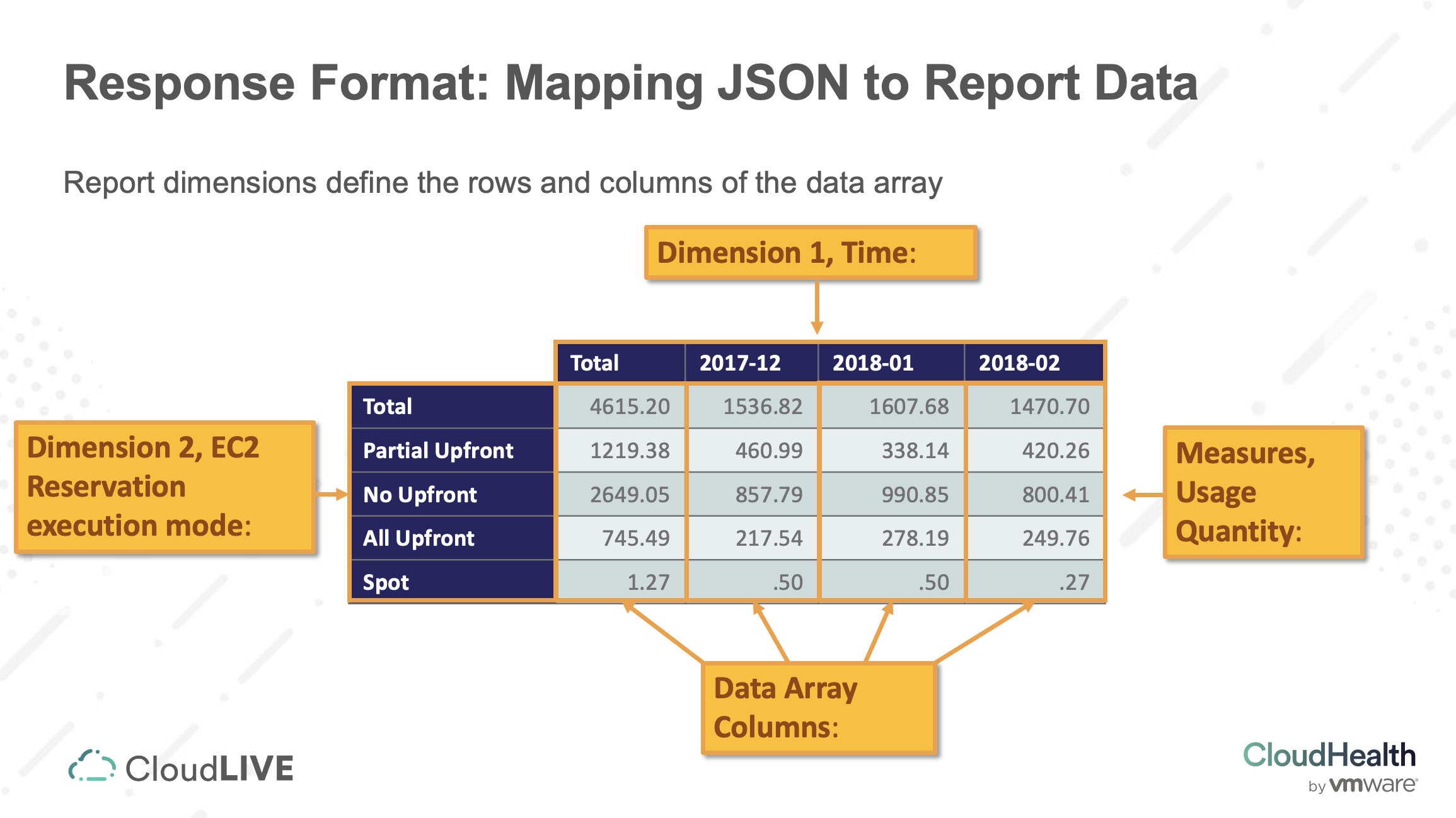 Here we see the JSON for the report, with a set of data columns that correspond to the report dimensions: