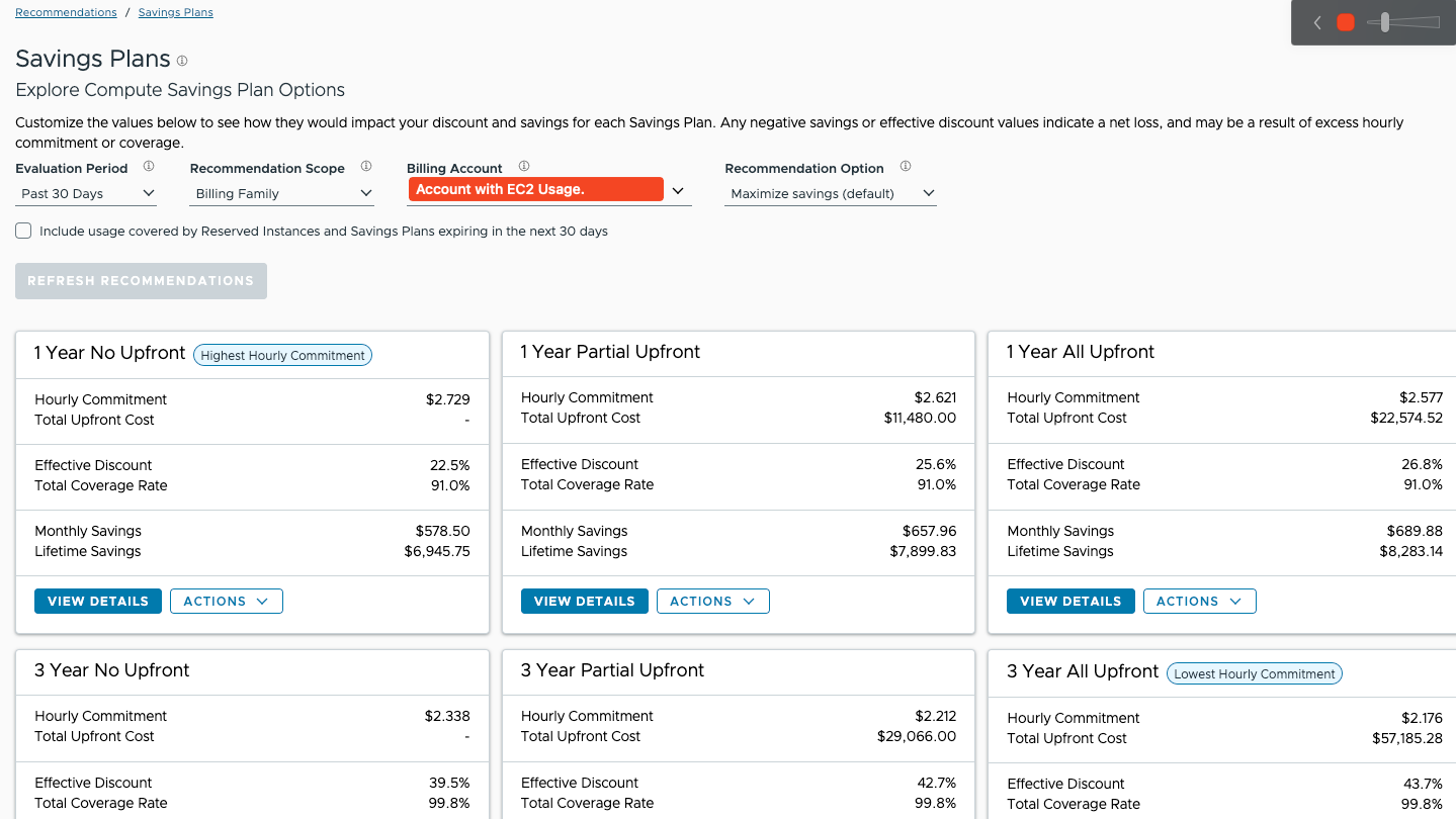 Subsequently, in the Savings Plan Recommendations if we change the Billing Account to the account with usage, we can get the recommendations:
