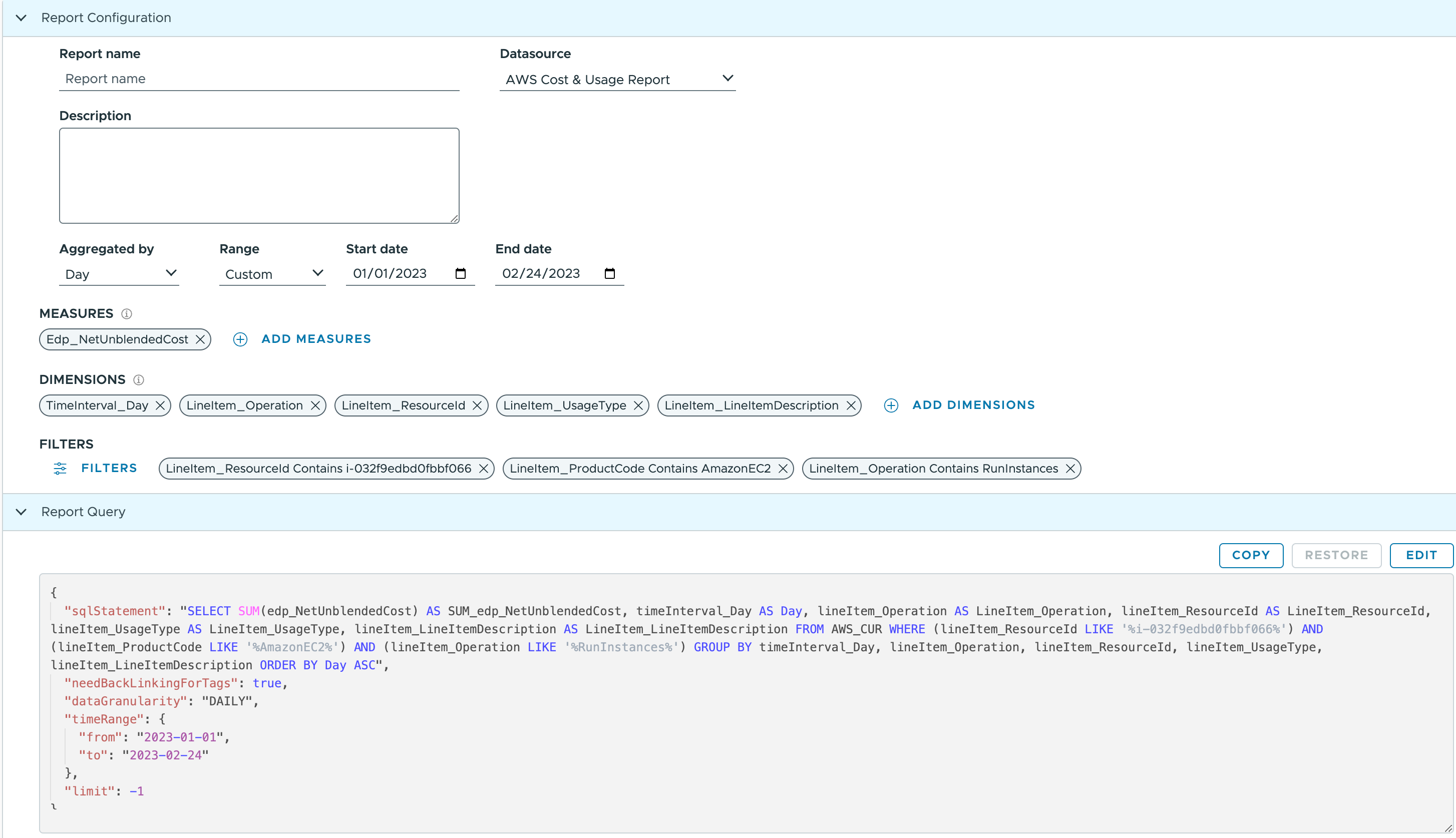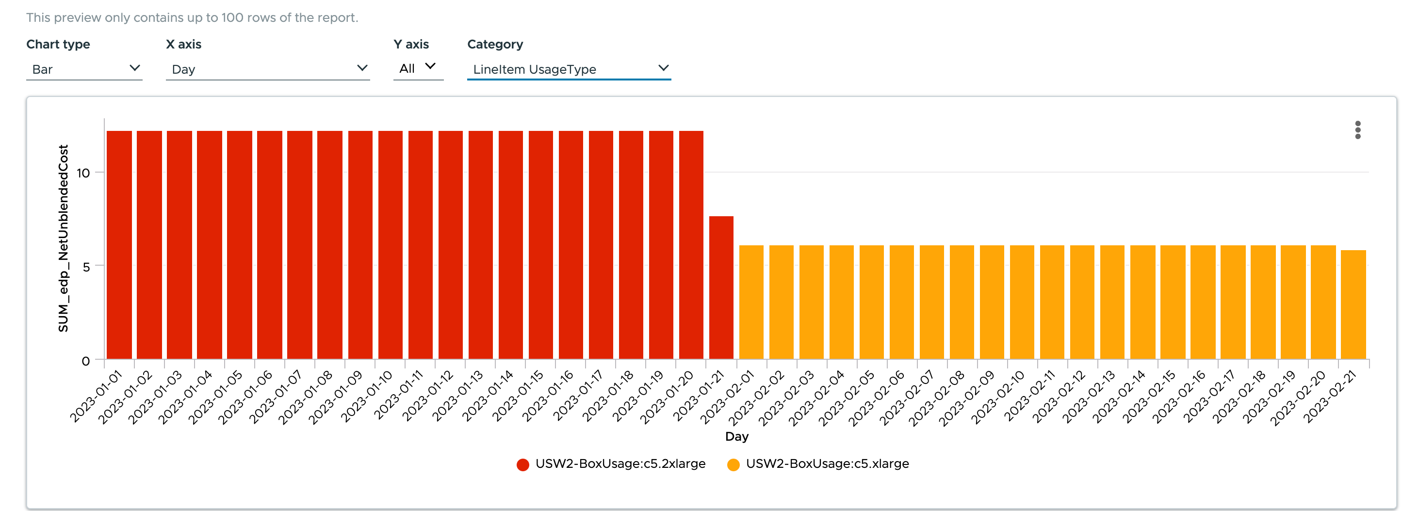 If you build a FlexReport for this specific Instance ID “i-032f9edbd0fbbf066”, you can see the Instance size change on Feb 1, where the price drops.