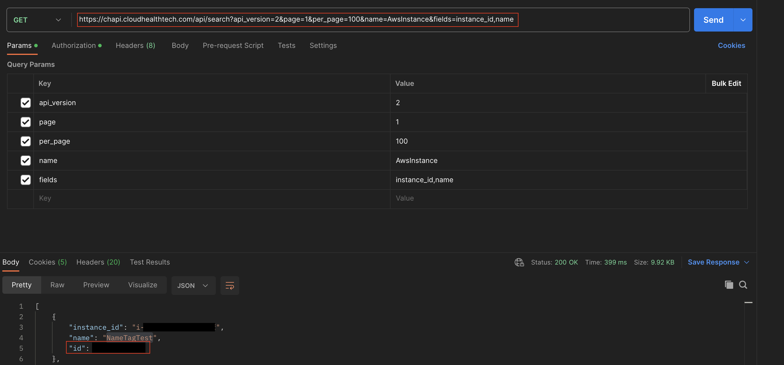 For example, you can see in the below screenshot we can return a list of instances with their instance id, and name using https://chapi.cloudhealthtech.com/api/search?api_version=2&page=1&per_page=100&name=AwsInstance&fields=instance_id,name ...with the internal ID included by default: