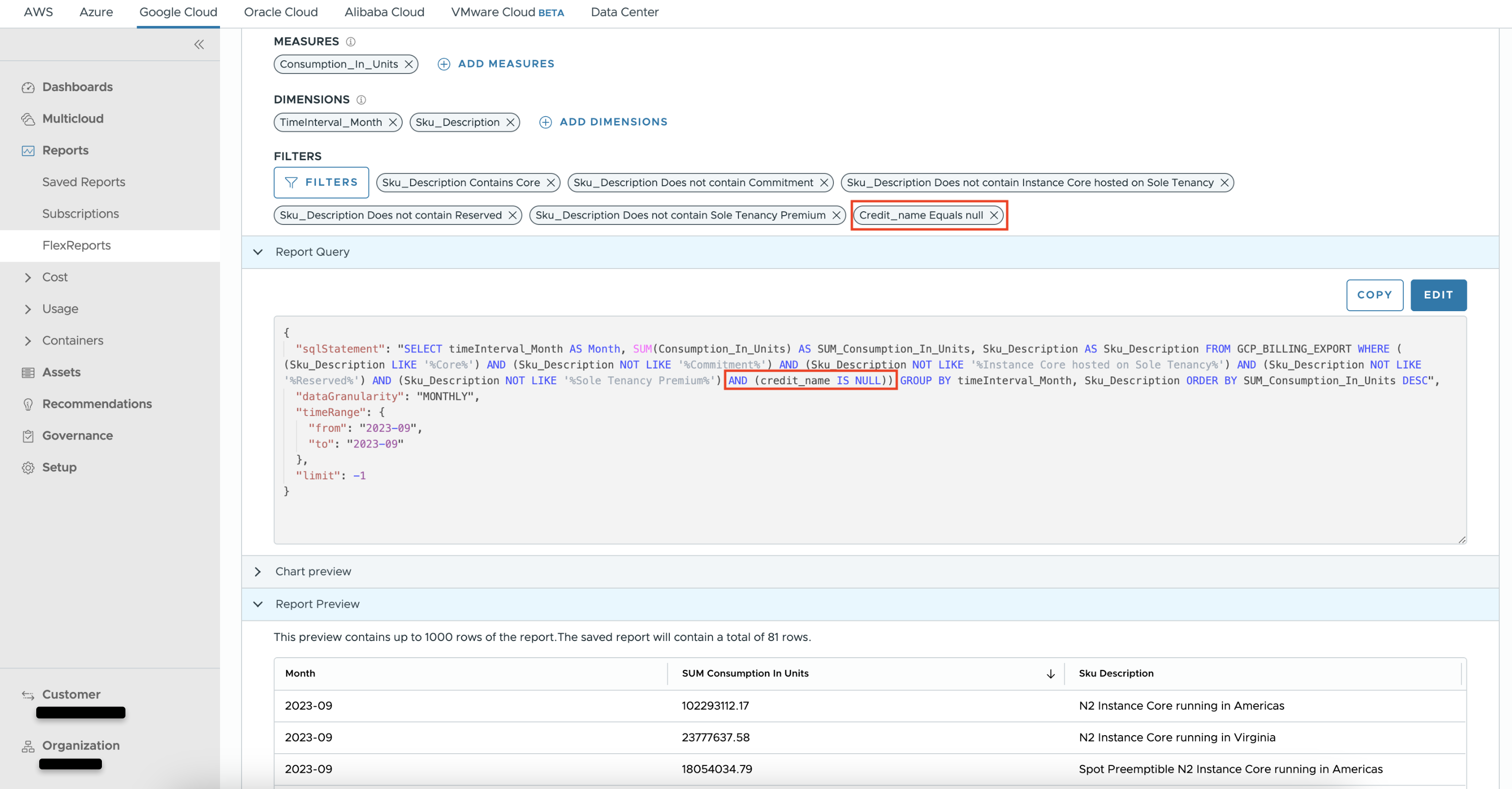 When querying FlexReports (FR) 'Consumption In Units', it is important to not include or filter the credit line item cost (credit name is null) to get the actual On-Demand consumption of units, otherwise it show proportionately high as per the credit line items.