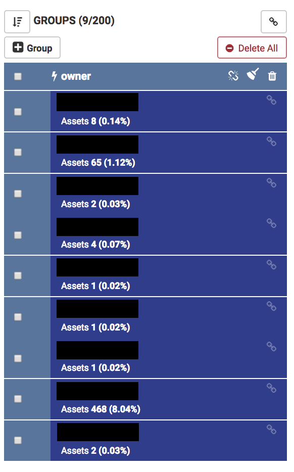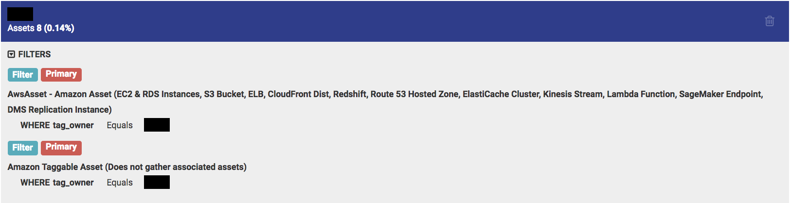For example, if you categorize a group by 'AWS Taggable + Associated Assets' with tag 'owner', you'll get results associated to the above asset types listed as well as gathering related assets. However, not all assets are covered by this search parameter so you may have some assets left unallocated that you would want included. One way to gather the remaining assets is by running the filter rules a second time using 'AWS Taggable Assets Only' with the same 'owner' tag. This will create another dynamic block of assets which can be merged into the existing block by selecting the check box at the top of both dynamic blocks and give a more complete view of the asset groups. See below for steps regarding how to merge two dynamic groups:
