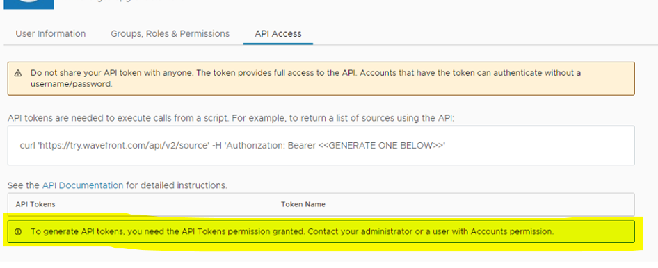 If user is not able to see the API tokens , the following error will be generated , this means the account is not having the required permissions to generate the tokens.