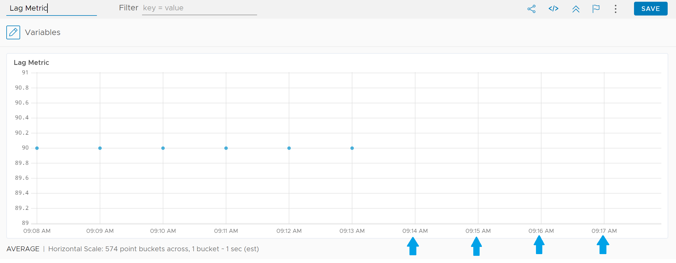 Another aspect to note is when the metrics come in, do they report in the current minute, or do they report in a previous point in time? A metric that comes in after a delay or "lag" is backfilled into its correct time slot. The timestamp of the metric is honored even if it did not arrive at that time. In the image above, if at 09:18 we ingest a metric that was created at 09:14 the point will populate the chart at 09:14.