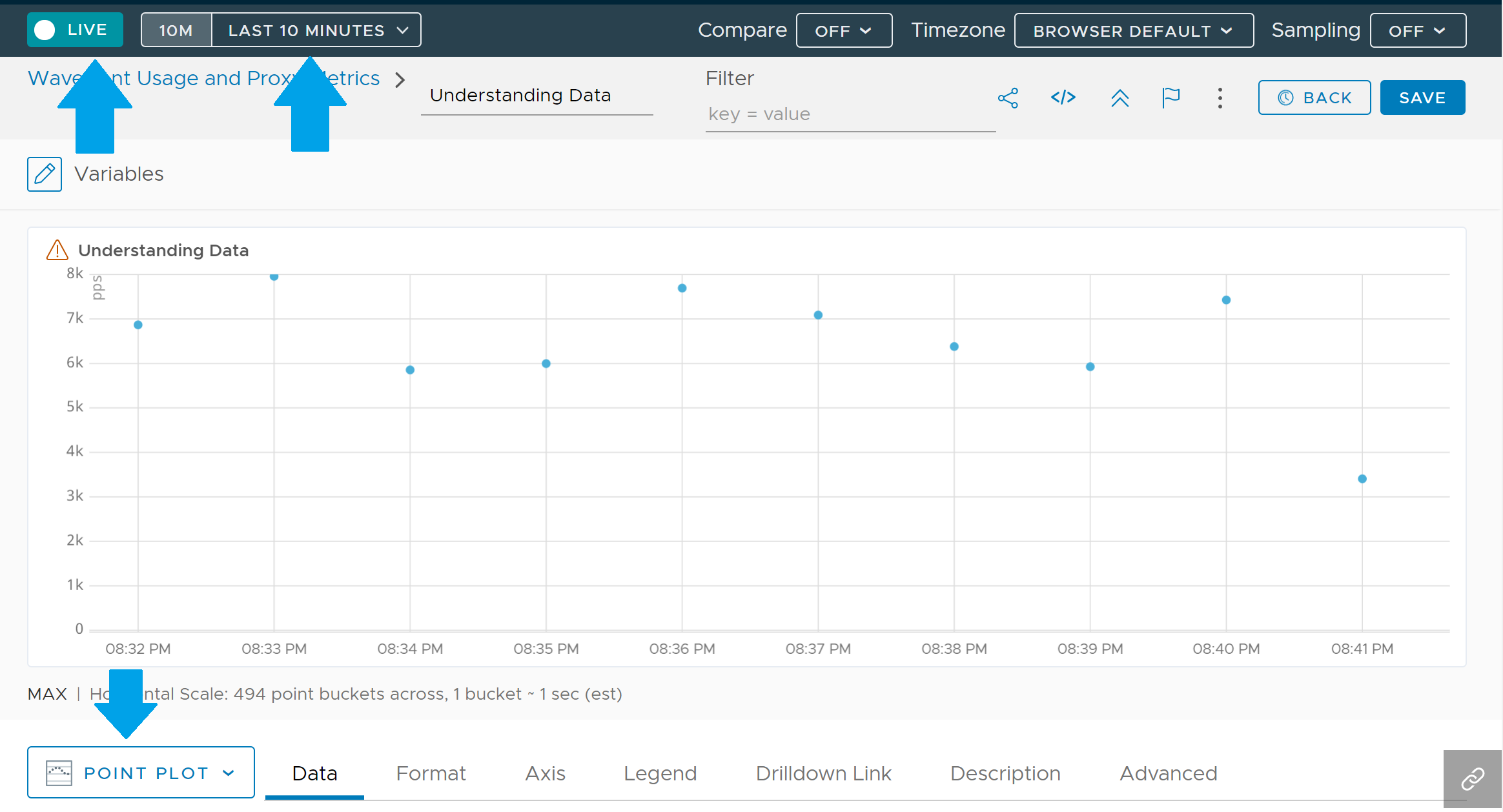 To get a clear view of your data shape, we suggest that you change the chart type to ‘point plot’ and time window to ’10 minute’ in a ‘live’ view.