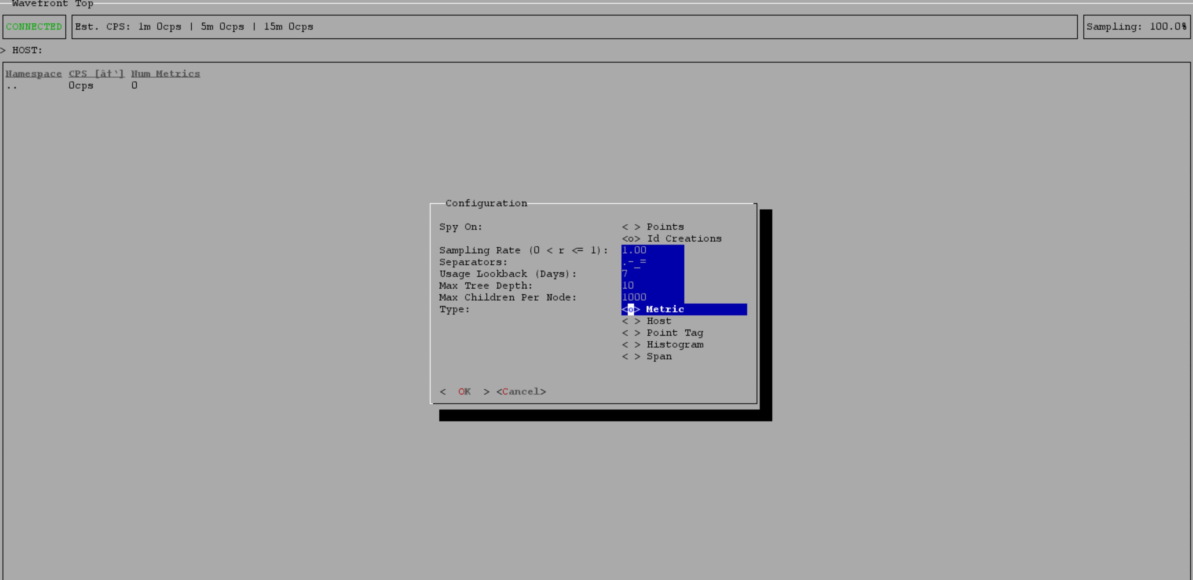 Wftop can also be used to spy on the new IDs being ingested. Once connected to the instance with wftop, change the configuration to spy on 'Id Creations' with a sampling rate of 1.0 (100%) and then select one of the metric, host, histogram or span types and the new IDs will be displayed in the Wftop pane.