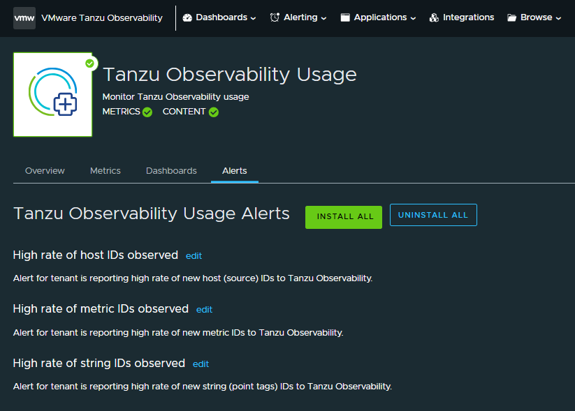 The Usage integration includes predefined alerts to monitor new metrics being sent, which may include metrics with potentially problematic data quality