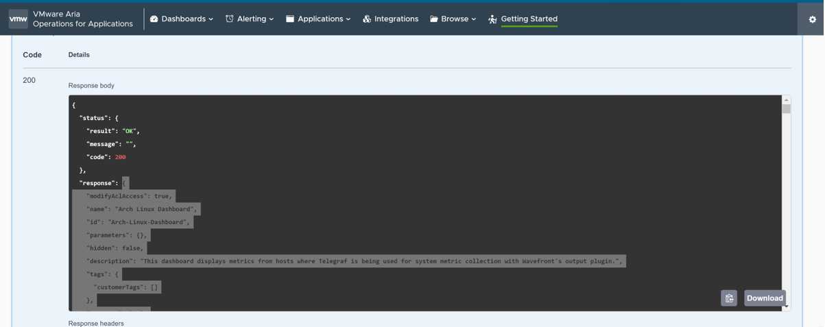 - Make a GET request to the /api/v2/alert/{id} endpoint using the id you just obtained in the previous step. Make sure you are pointing to the source Wavefront environment URL and using the API token associated with the source Wavefront environment.
