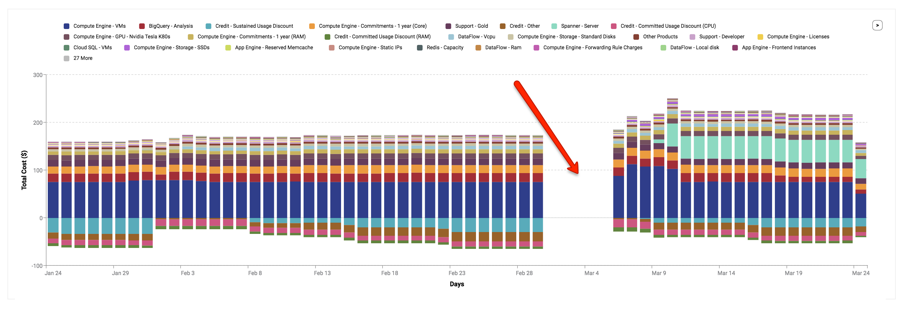 There are situations where the total cost won't line up correctly because daily costs weren't fully ingested for a day or number of days. Looking at the daily view is a great way to quickly get an idea of if the total cost being off is due to missing or incomplete daily data. Daily reporting anomalies may manifest looking like gaps or very low cost in comparison to surrounding days that can tip you off to a problem: