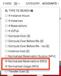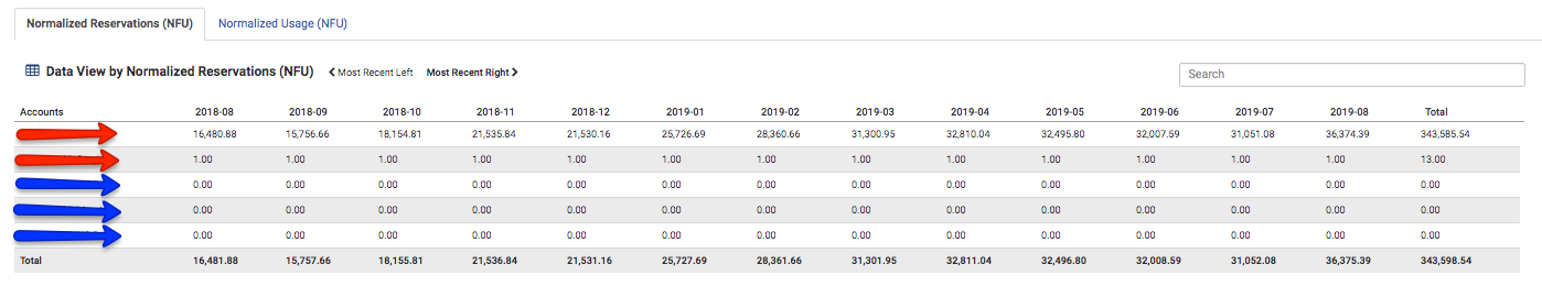 The "Normalized Reservation (NFU)" tabulated report below the graph will show you a breakdown of accounts where reservation value exists. In other words, this represents where the reservations were purchased. In the below example, the red accounts have reservations (with nearly all on the top) and the blue accounts have none: