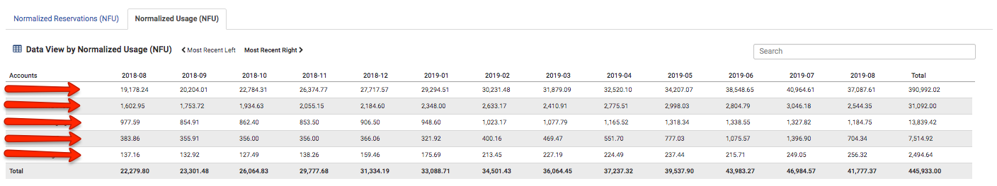 The "Normalized Usage (NFU)" tabulated report below the graph will show you a breakdown of where the reservation coverage could took place. The below example is the same set of accounts as above but it represents usage associated to accounts. You'll notice that all accounts are now red because reservation coverage can float to any of them: