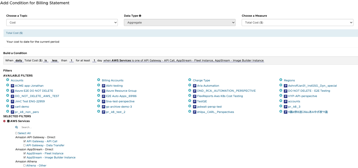 2) "Amazon AppStream - Direct" will evaluate based on the sum total of "AppStream - Fleet Instance"plus the "AppStream - Image Builder Instance" items because both are selected (but for NOT each individual item).
