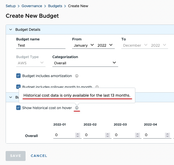 As a workaround, you can manually obtain historical data by configuring a cost report to use archive snapshots, which will show you a historical snapshot of costs taken in that period: