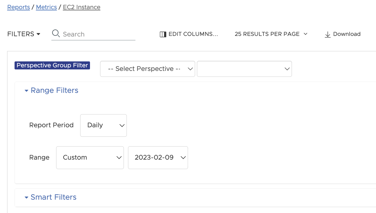 For example, the Metrics / EC2 Instance report screenshot below was taken on Feb 10th with the data showing from the day prior: