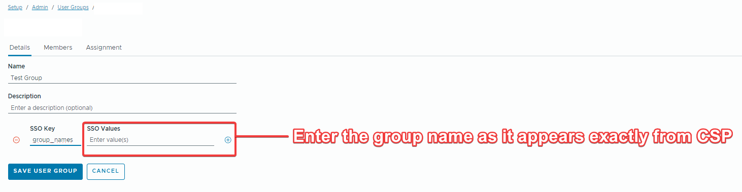 This will open the following page that allows you to define a SSO Key (Attribute) and SSO Value. The SSO Key that will need to be used is "group_names" and the value will be the name of the group as it appear in CSP within the Identity & Access Management -> Groups tab in the name field including the domain.