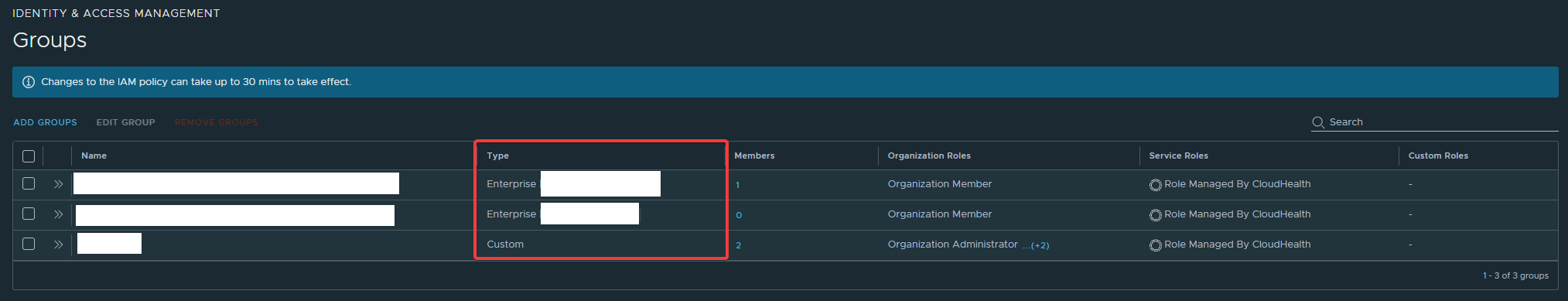 Note: Configuring Enterprise Groups relies on the Group attribute being passed from the IDP, if the Group attribute wasn't configured when configuring SSO, you will need to manually populate groups as per the "Mapping Custom groups to the Tanzu CloudHealth Platform" section below and perform those steps.