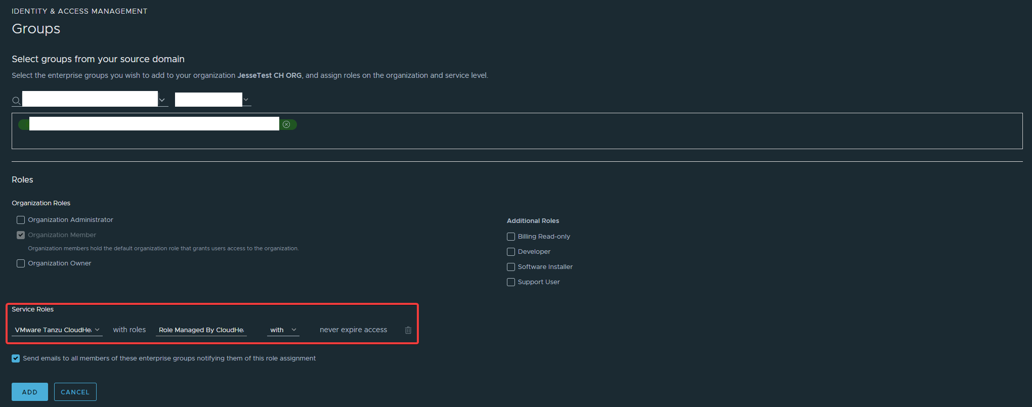 Once the group has been created, and members have been added you can proceed with mapping the group to the Tanzu CloudHealth Service -
