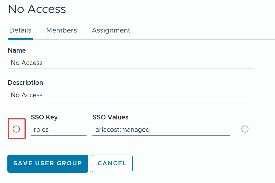 If you need to re-add the mapping, navigate back to Setup -> Admin -> Usergroups, select the "No Access" Usergroup. Select the Edit option again, and specify a SSO Key: roles, with SSO value set to ariacost:managed.