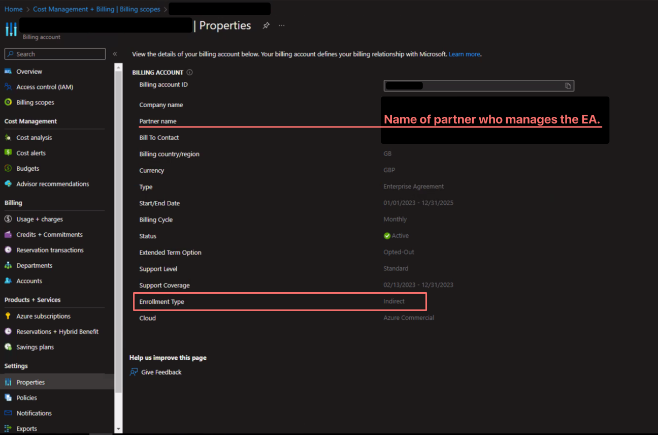 Once the EA is configured, contact your partner (who manages the EA account) to enable the "AO and DA view charges" option under Azure Cost Management settings. Refer to the Microsoft KB to enable these options: https://learn.microsoft.com/en-us/azure/cost-management-billing/costs/assign-access-acm-data