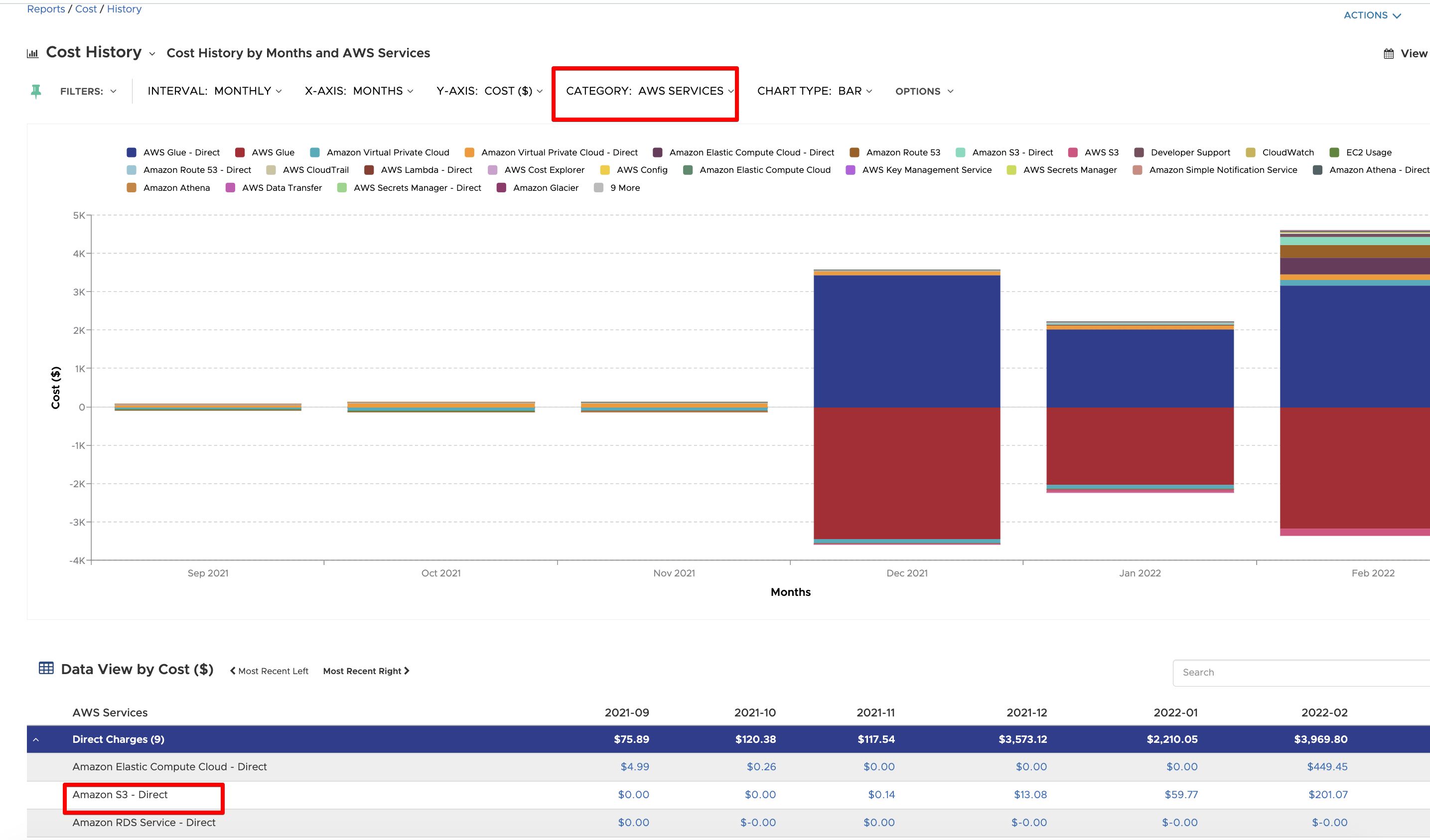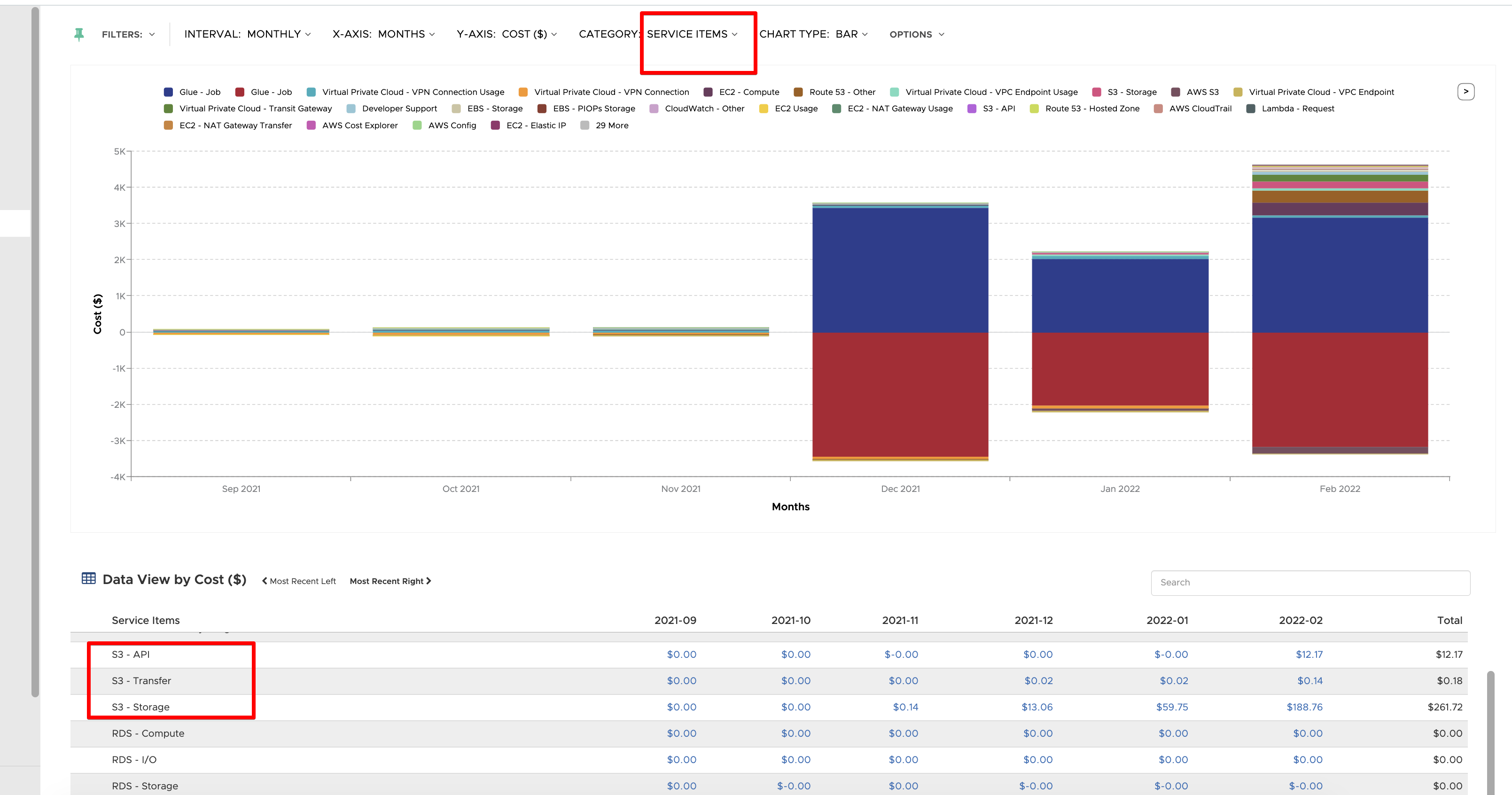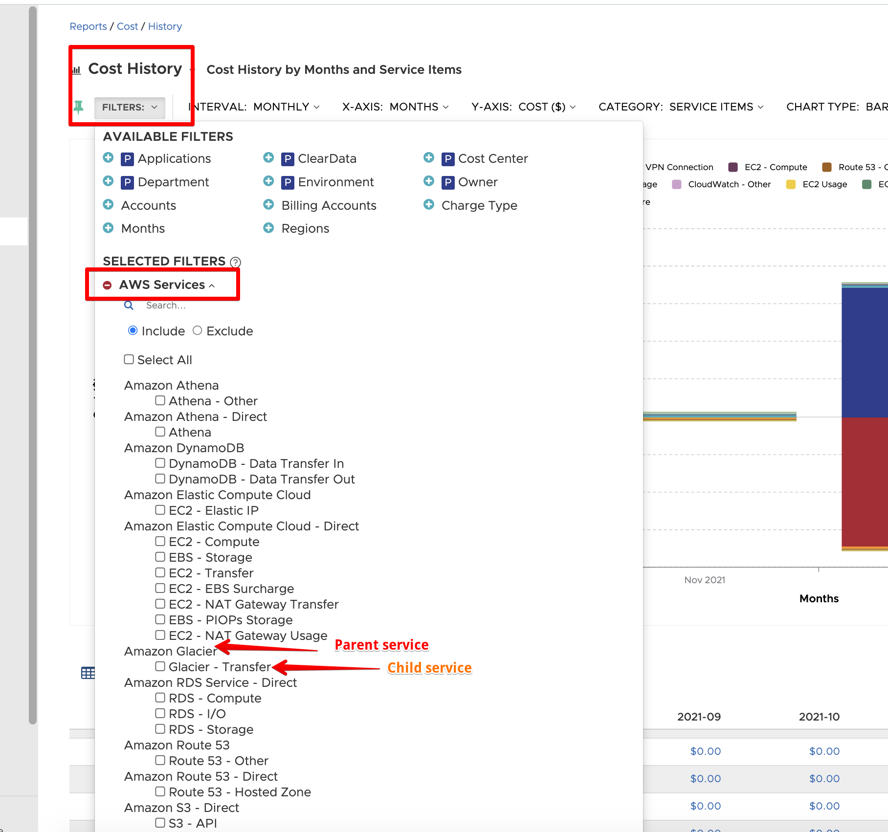 Another way to see this breakout is by referencing the "AWS Services" filter and viewing the options listed: