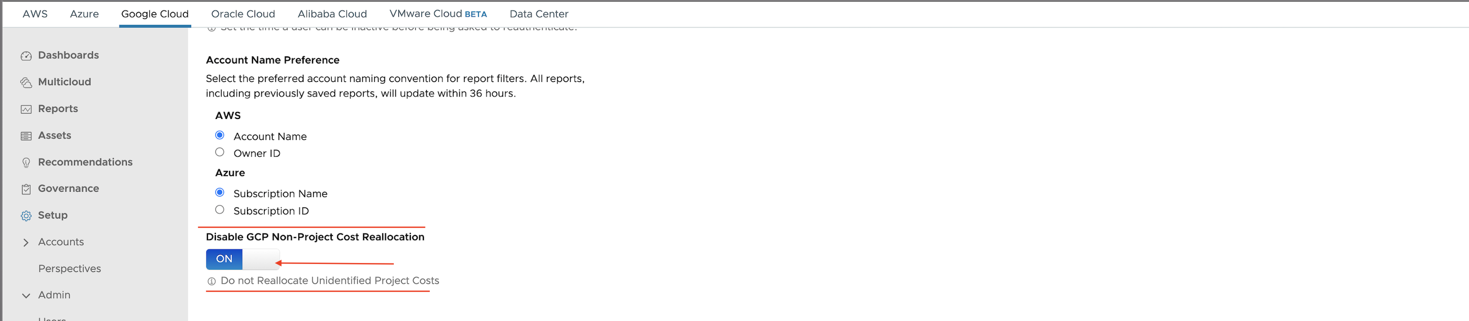 Enabling the Disable GCP Non-Project Cost Reallocation feature will ensure Unidentified Project Costs do not get reallocated to the projects but this setting does not apply to historical dates automatically unless bill collection happens again for a historical date due to cost change.