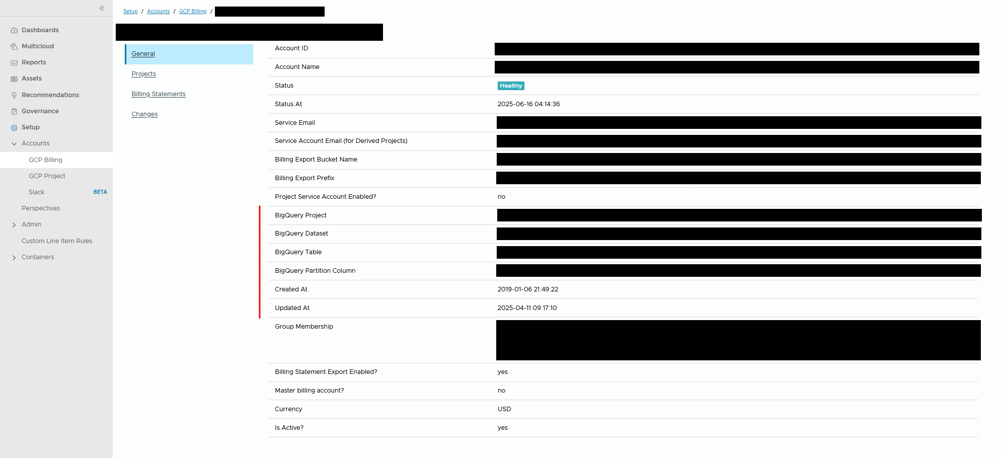 To see if BigQuery is enabled, click Accounts on the left-hand menu, then click view icon to the left of the desired GCP Billing account.