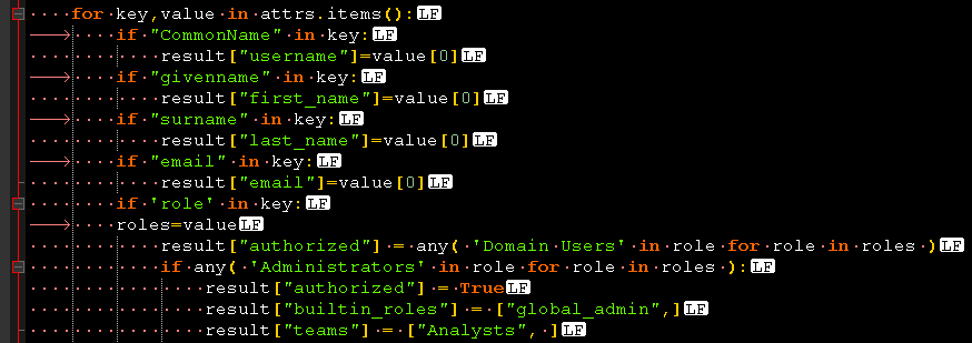 TabError: inconsistent use of tabs and spaces in indentationA combination of extra tabs and spaces located in the /etc/cb/sso/attr_map.py file