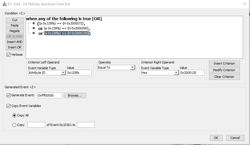 The following is a screen shot of an Event Condition rule configured on the 0x00010301 event that looks at the value of the Model_Handle attribute id 0x129fa. If the value is equal to 0x2000072 (which is the model handle of a model in the Spectrum database), than generate event 0xfff00000 which is the Trigger event for my Heartbeat Event Rule.