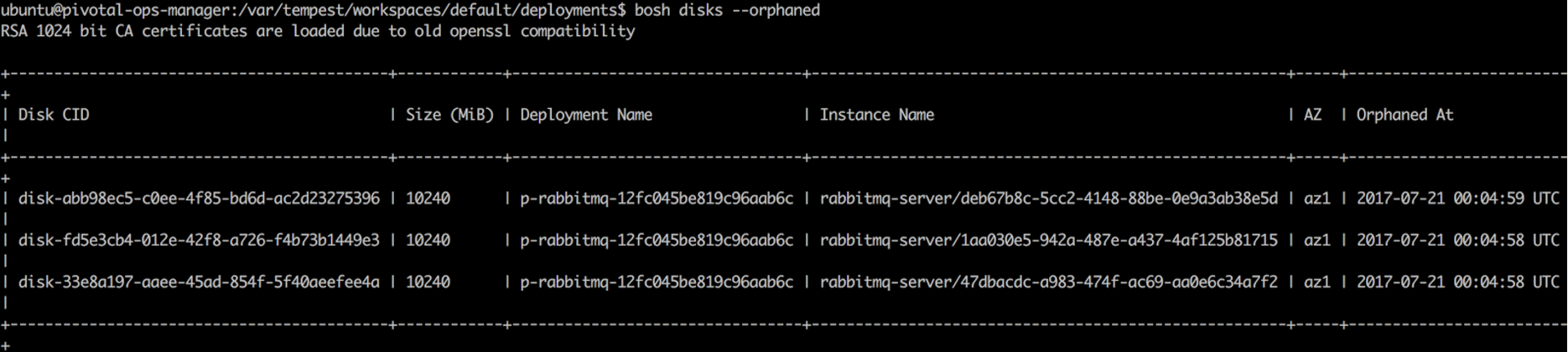 Note: If you do not see any orphaned disks then the persistent data has been deleted, and it's not possible to restore the deleted deployment. In this case, this KB is not applicable to your use case, so you would need to reinstall the missing tile and restore your data from a backup.