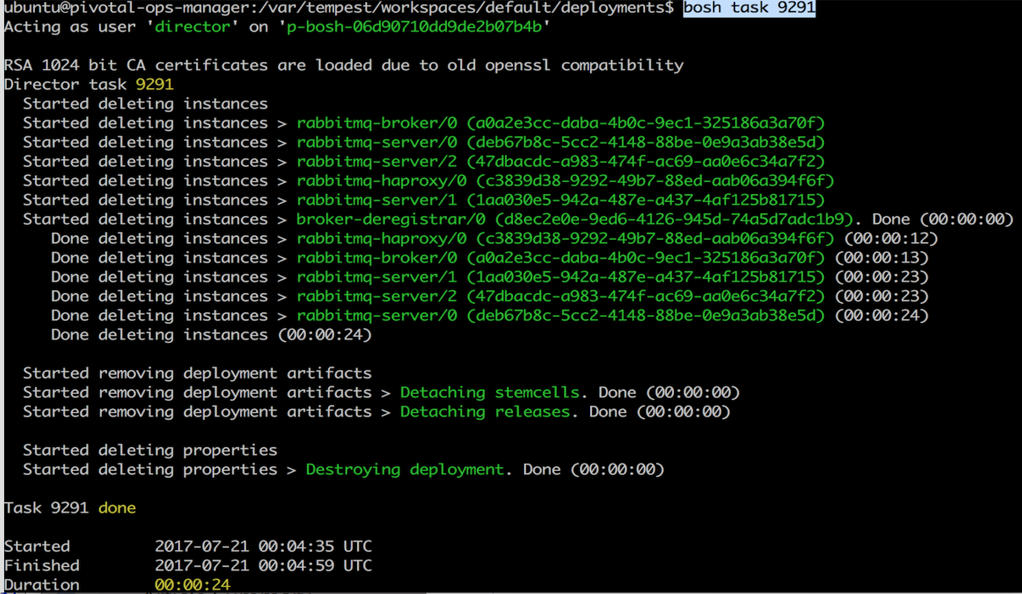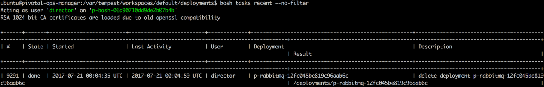 Execute `bosh task <task-number>`, where `<task-number>` is the task number from step #1. In our example, it’s `bosh task 9291`, which will list the deleted VM id's like below