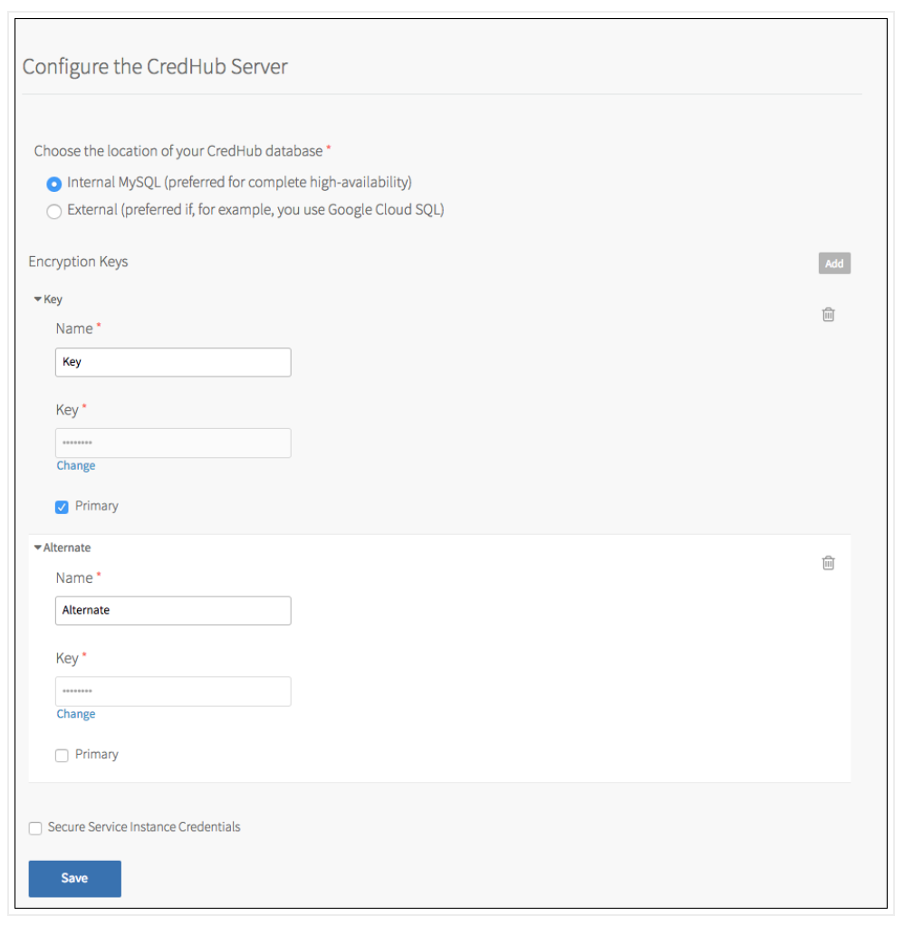 While configuring CredHub in Operations Manager for PCF 2.0, CredHub deployment fails with the following errors: