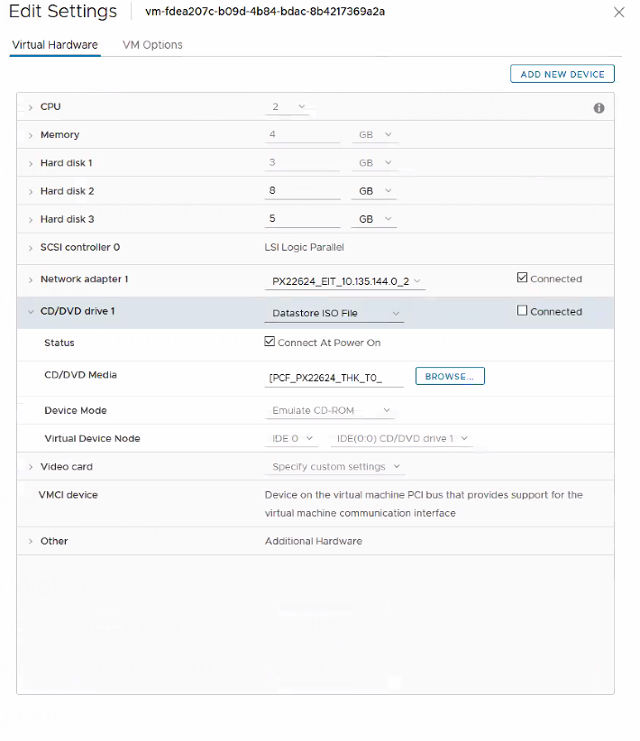 <VM-CID>/env.iso" for affected VMs.bosh instances --details | grep worker/1aa8a864-6b0c-4e73-b712-6a7662e71184"<VM-CID>/env.iso" file from the list that corresponds to the VM. If you cannot find the env.iso file inside the VM folder, shutdown the VM from the vSphere UI and let BOSH resurrector recreate the unresponsive VM. If BOSH resurrector is not enabled in BOSH director tile, run the command bosh -d <deployment> cck against the deployment where is located the VM and choose to recreate the unresponsive VM.bosh instances command.