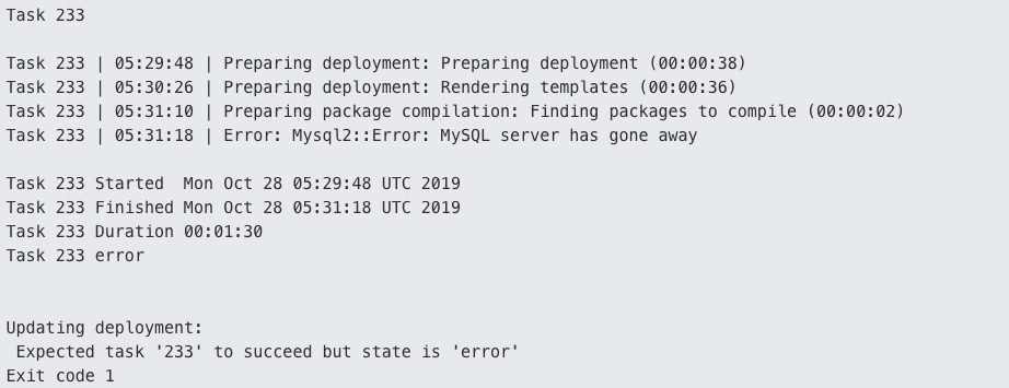 E, [2019-10-28T05:31:18.087192 #4426] [task:233] ERROR -- DirectorJobRunner: Mysql2::Error: MySQL server has gone away: (conn: 47089563510420) UPDATE `deployments` SET `name` = 'cf',