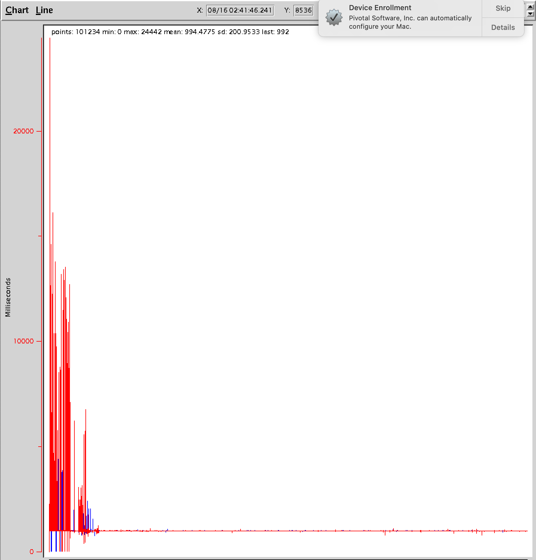 You can see the Survivor space getting overwhelmed during the startup phase of a GemFire cache server given all of the data getting loaded. In the 2nd chart, you can see how this can negatively impact JVM Pauses, potentially causing startup issues.