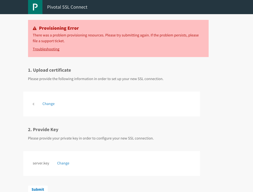 Aug 02 10:09:03 SSL-Service b401ef18-3efd-4750-b8a3-98e42115dbc9/[APP/1]: {"timestamp":"1470157743.573615074","source":"ssl-service","message":"ssl-service.service.ConfigureInstance.error","log_level":2,"data":{"error":"UploadServerCertificate: InvalidParameter: 1 validation errors:\n- field too short, minimum length 1: CertificateChain","instanceID":"08f1cb10-1420-40ff-8a27-814c76d22e15"}}