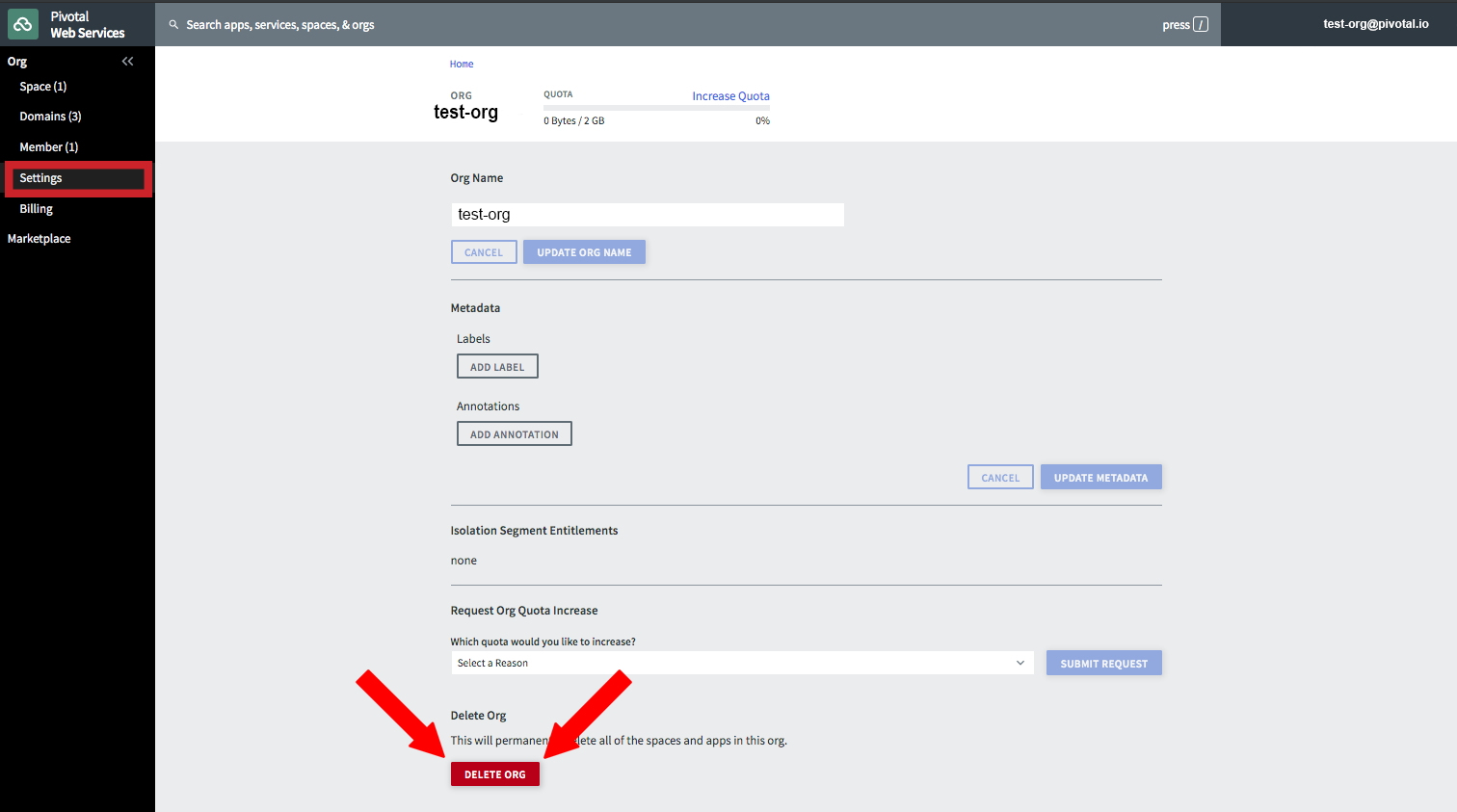 6. Click the appropriate Org's link and go to Settings (located on the panel on the left hand side) > REQUEST TO DELETE ORG (at the very bottom).