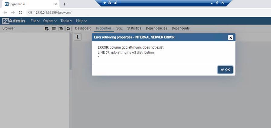 The pgAdmin 4 tool has been removed as an experimental feature. It is not officially supported by Broadcom VMware Support.