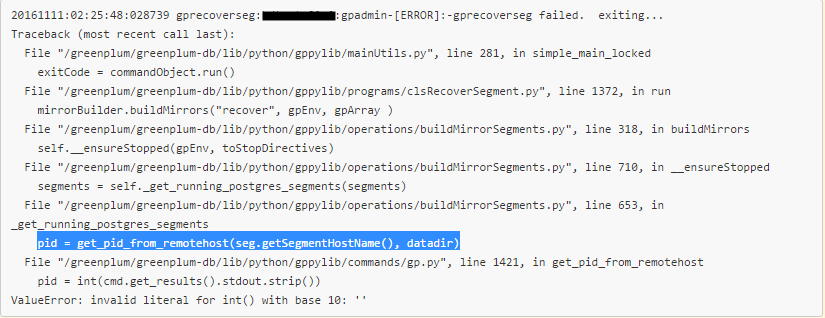 gprecoverseg with verbose fails with the error message "ValueError: Invalid Literal for int() with Base 10" and no specific/evident error seen on the master, primary and mirror logs:
