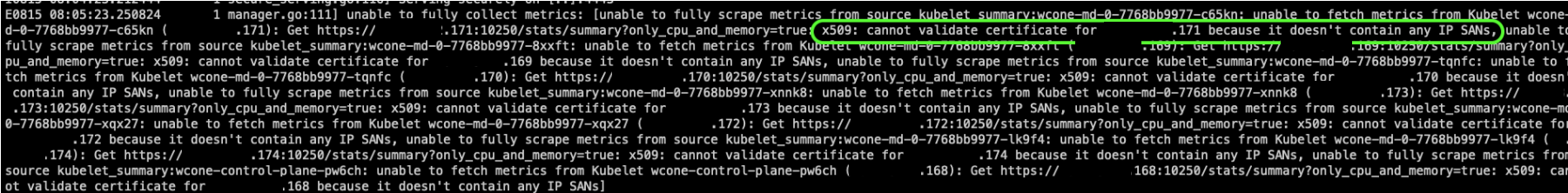 "unable to fetch node metrics for node <node-name>: no metrics known for node""unable to fully collect metrics: [unable to fully scrape metrics from source kubelet_summary", "dial tcp: lookup <node-name> on <node-IP>:53: no such host""x509: cannot validate certificate for <IP> because it doesn't contain any IP SANs"Both the DNS resolution and the certificate validation issues (Symptoms #1 and #2) can be resolved by editing the metrics-server deployment and adding the following flags in the "args" property: