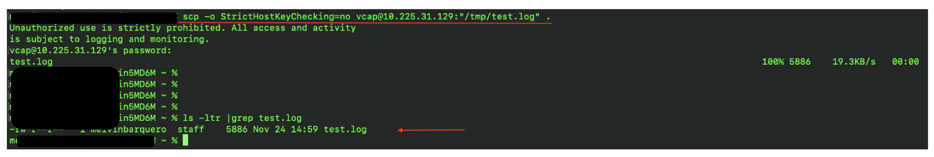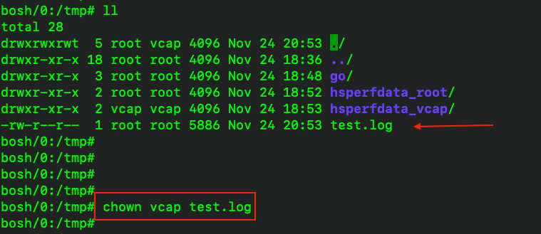 Step 5) In order to extract the file for further analysis change the owner to vcap with the chown vcap <FILE_NAME> command.